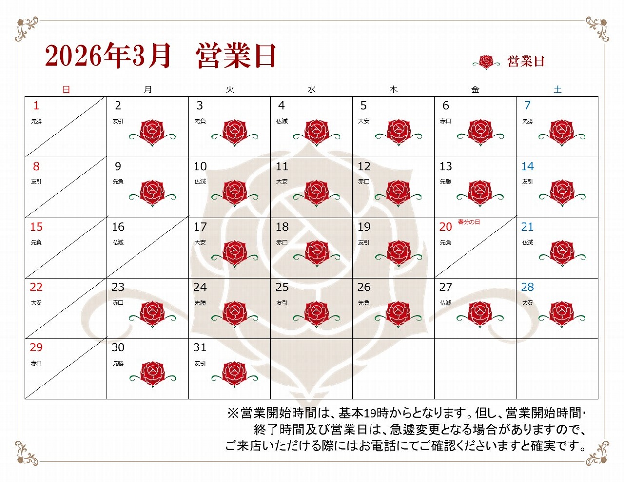 2026年3月の営業日のご案内